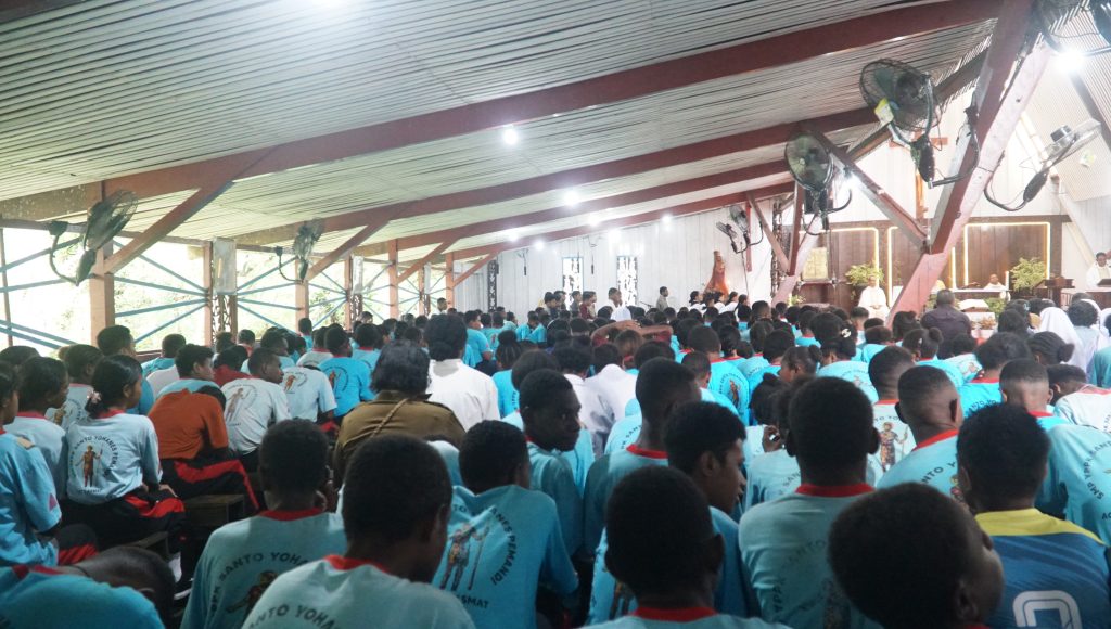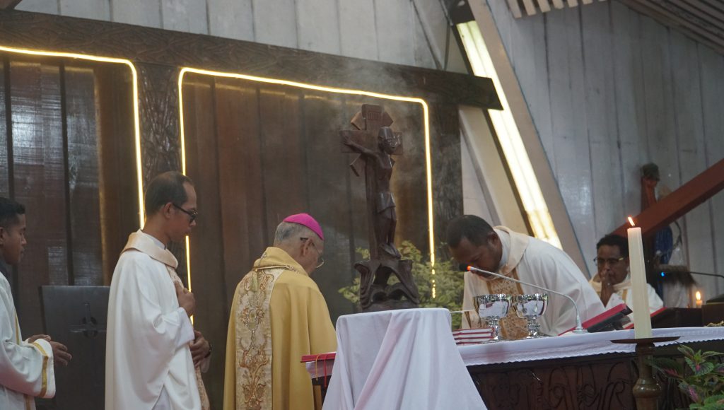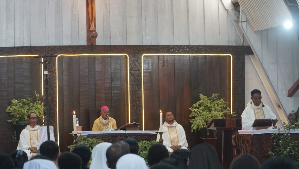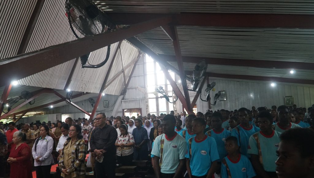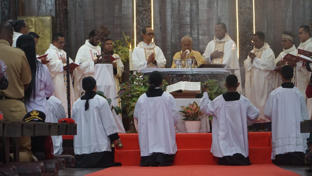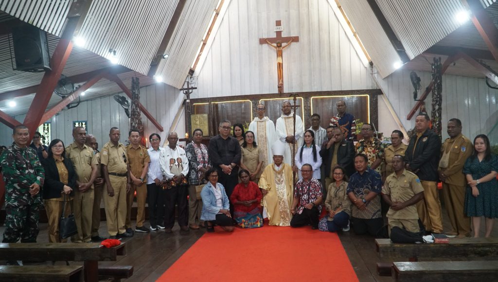 KOMSOS – Perayaan Misa Syukur Tahbisan Episkopal ke-23 Uskup Agats, Mgr. Aloysius Murwito, OFM, dipimpin oleh Bapa Uskup didampingi RD. Inno Rettopjaan, RD. Vesto L. Maing, RP. Tjatur, OSC, Dkn. Ambros, OFM, serta para imam konselebran lainnya yang berlangsung di Gereja Katedral Agats. Senin (15/09/2025).