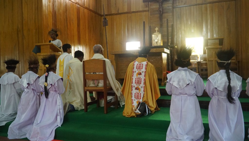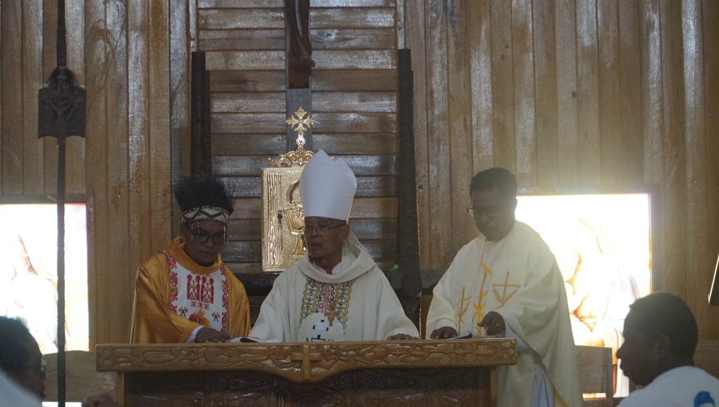Perayaan ekaristi berjalan dengan penuh khidmat, diiringi lantunan lagu-lagu daerah yang menambah suasana sakral sekaligus memperkaya kekayaan liturgi dengan budaya setempat.