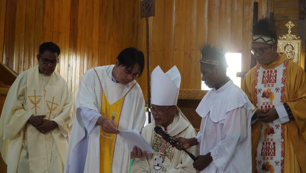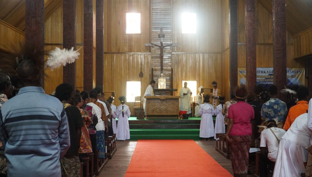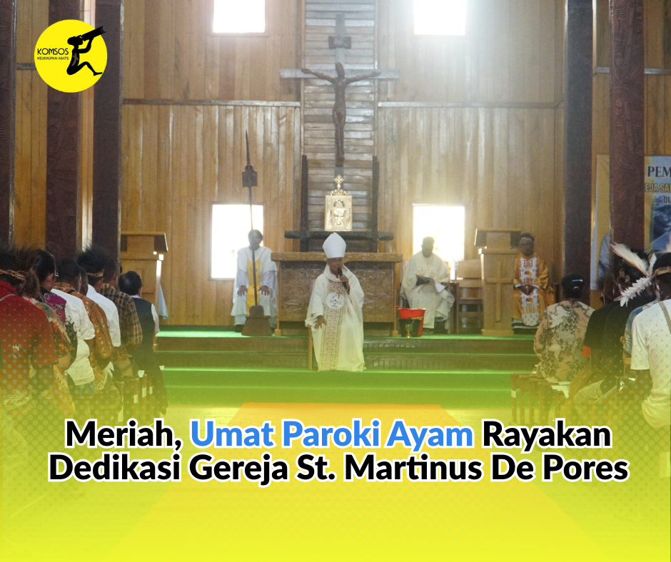 KOMSOS — Suasana penuh syukur dan sukacita umat Katolik Paroki Ayam menyelimuti Perayaan Ekaristi pada Minggu (21/9), ketika Gereja Katolik St. Martinus De Pores secara resmi didedikasikan dan diberkati. Perayaan ini dipimpin langsung oleh Uskup Keuskupan Agats, Mgr. Aloysius Murwito, OFM, didampingi para imam konselebran: RD. Herybertus Hibau, RD. Hillarius Salmon, RD. Vesto Labi Maing, RD. Moses Amiset, dan RD. Paul Buarlele.
