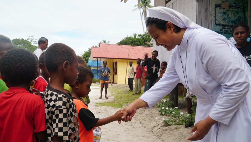 Suster Aurelia, FSGM mulai mengatur barisan anak anak, beberapa langsung dipanggil satu per satu oleh suster untuk menerima bungkusan kecil yang berisi camilan. Wajah-wajah mereka bersinar penuh kebahagiaan. “Terima kasih, Suster! Terima kasih, Bapa Uskup!” mereka berseru, beberapa sambil memeluk hadiah mereka.
